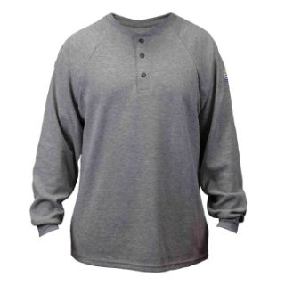 Union Line™ Henley T-Shirt, Long Sleeve, Series: 10896-03, 2XL Size, Gray, 50% Modacrylic/25% Cotton/13% Aramid/12% Lyocell, 6.5 oz Fabric Weight, Button Placket Closure, Resists: Arc Flash and Flame, Specifications Met: ASTM F1506, CAT 2, CSA Z462, NFPA 70E, UL Listed to NFPA 2112, OSHA 1910.269