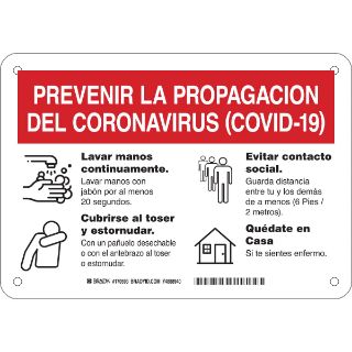"Prevent The Spread Spanish (COVID-19) Polystyrene Sign 7""H x 10""W RD/WH"