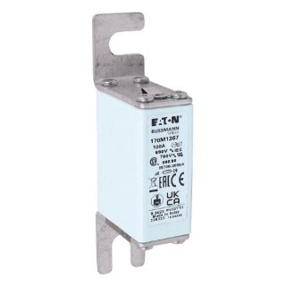 Bussmann High Speed Fuse, Type 80, Series: 170M, Non-Indicating, 100 A, 690 V, 200 kA Interrupt, Class: aR, 45 to 1000 Hz Frequency, Blade End Terminal, DIN 43 620 Mounting, Square Body, Ceramic, 100 mm L x 21 mm W x 40 mm H Body