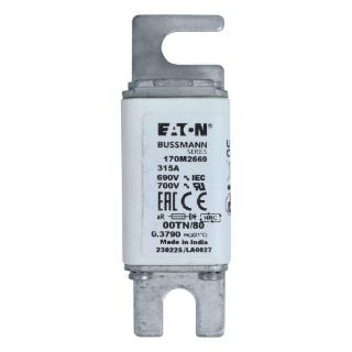 Bussmann High Speed Fuse, Semi-Conductor, Series: 170M, Non-Indicating, 315 A, 690 V, 200 kA Interrupt, Class: aR, Blade End Terminal, DIN 43-653 Stud Mounting, Square Body, 100 mm L x 30 mm W x 51 mm H Body