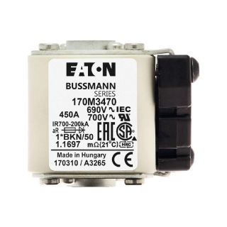 Bussmann High Speed Fuse, Semi-Conductor, Series: 170M, Non-Indicating, 450 A, 690 V, 200 kA Interrupt, Class: aR, Flush Mounting, Square Body, 51 mm L x 45 mm W x 59 mm H Body