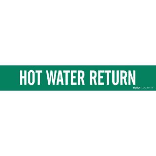 Self-Sticking Pipe Marker for Water - Pressure Sensitive Vinyl, Style 1HV, HOT WATER RETURN. Brand Name: Brady?. Type: Self-Adhesive. Special Features: Abrasion-Resistant, Chemical-Resistant, Water-Resisitant. Application: Pipe & Valve Marking. Standard: ANSI A13.1-2007. Adhesive: Permanent Acrylic. Durability: 8 to 10 Years Outdoors. Pipe Diameter: 8 or Greater IN. Color: White on Green. Compatible Surface Types: Rough, Textured. Size: 1HV. Legend: HOT WATER RETURN. Legend Size: 3.5 IN. Material: Brady B-946 Vinyl. Background Color: Green. Indoor or Outdoor Use: Indoor/Outdoor Use. Language: English. Self-Adhesive Pipe Marker Format: Die-Cut on Cards. Alternate Catalog Number: 109235.